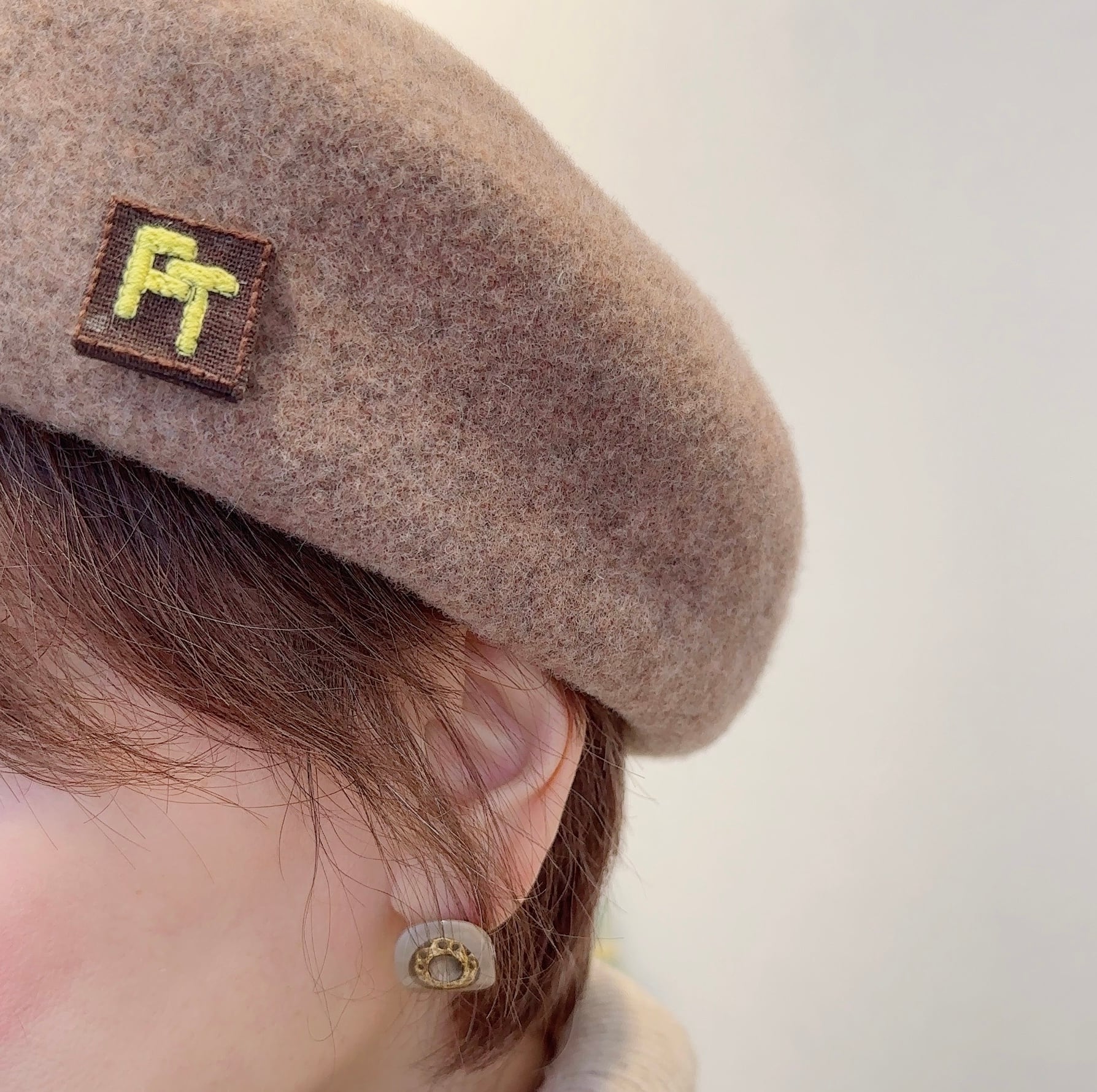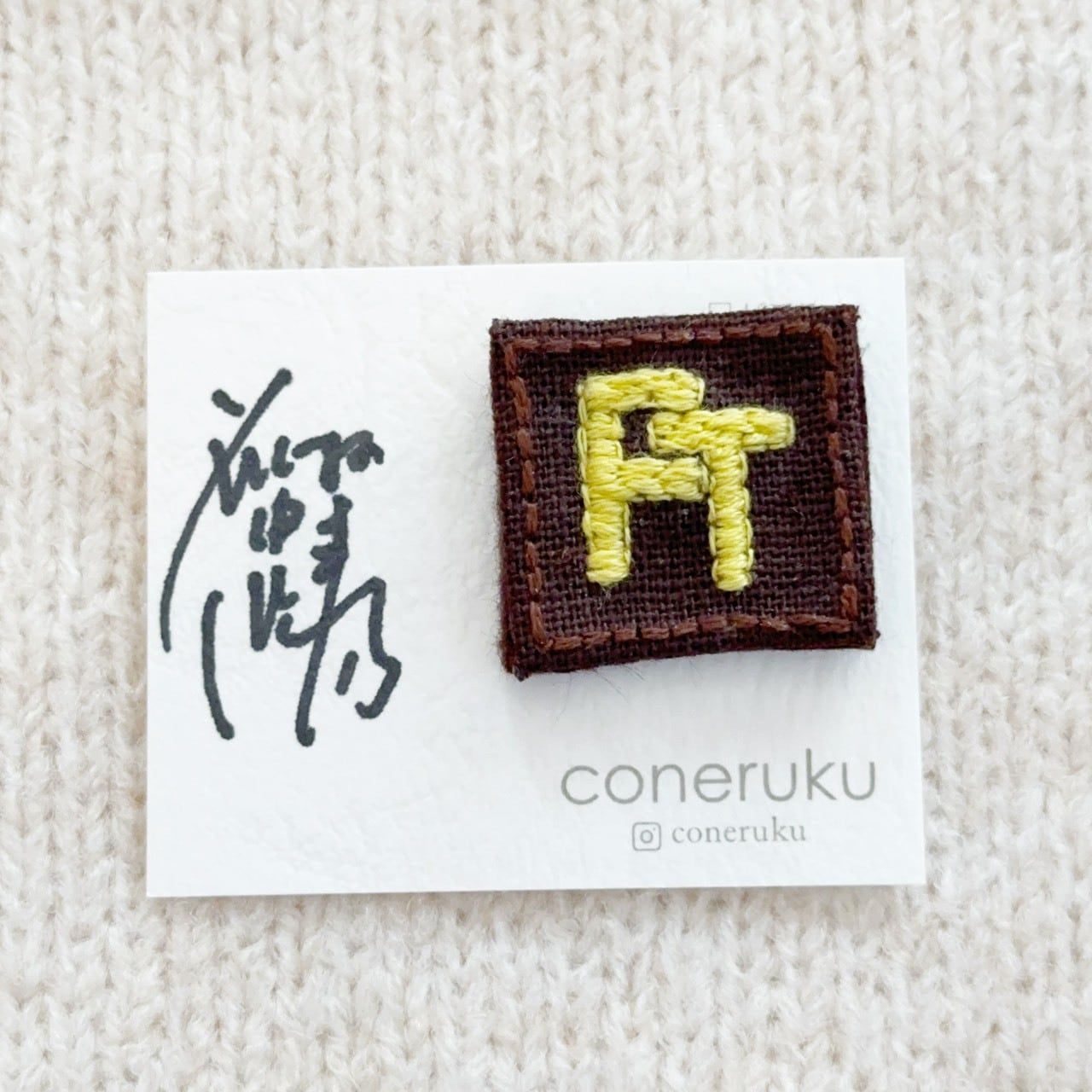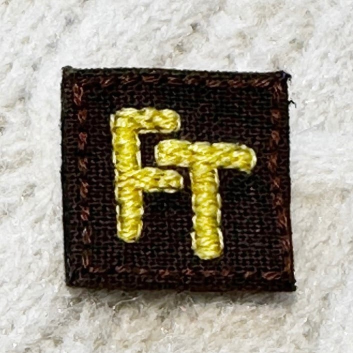 藤やんの頭文字を、パド◯スカラーで刺繍しています。創業60年の手芸店の技術の元、制作しました。